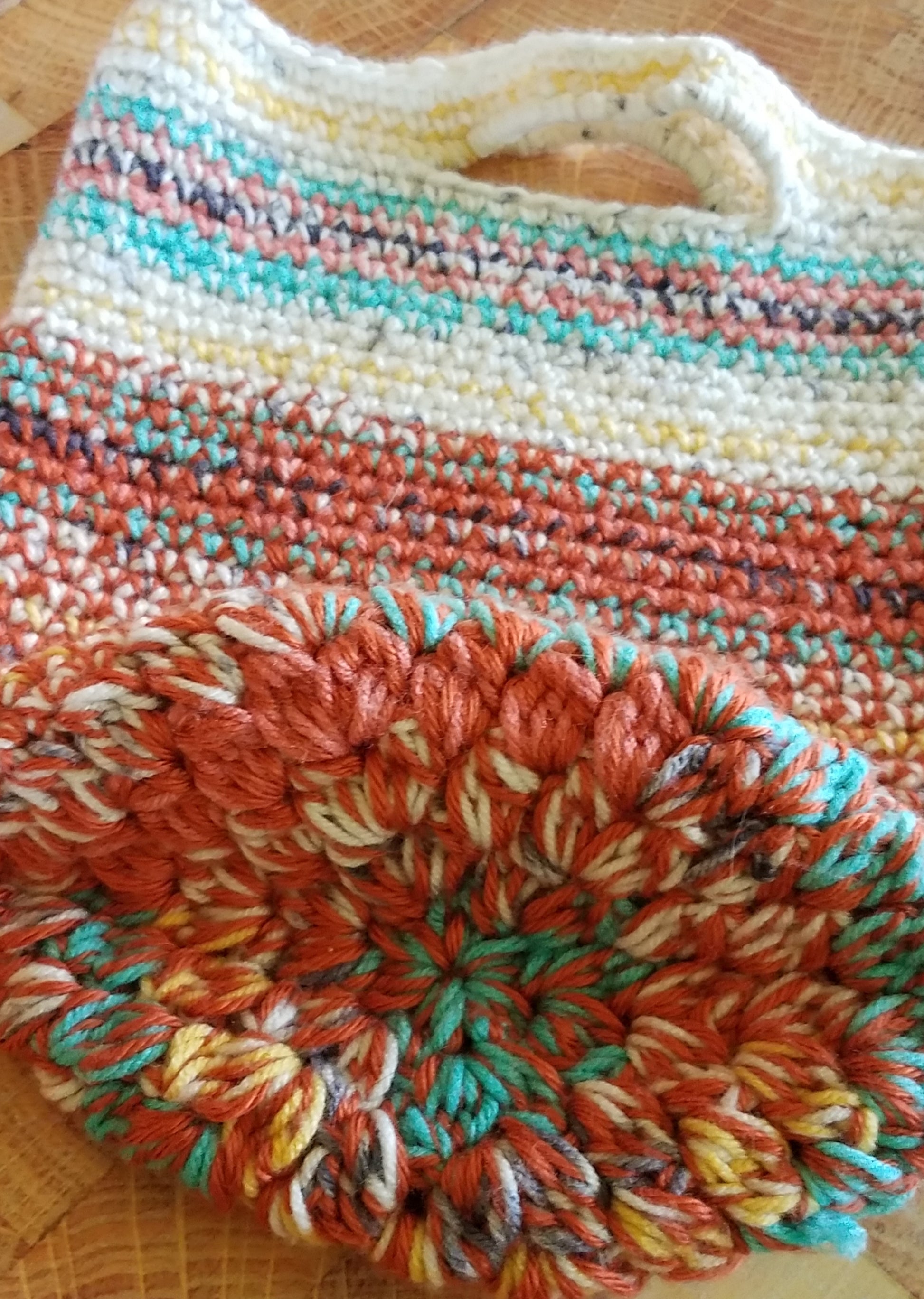 - Unisex, and for all ages. Hand crochet tote bag, double yarn for strength and durability. Various color combinations. As they are made from different yarns and textures, no two will be identical.